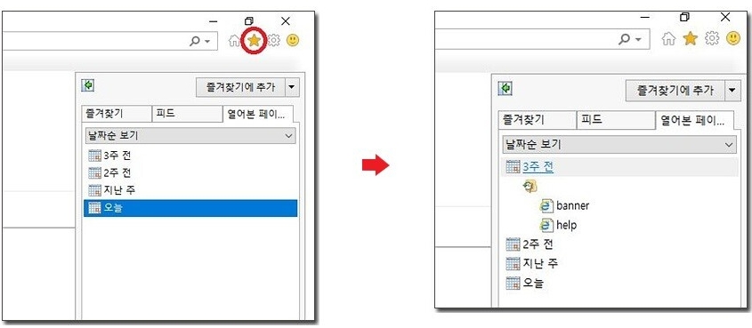 익스플로러를 열어줍니다. 상단에 별표 모양을 눌러주시면 즐겨찾기로 이동이 됩니다. 여기서 [열어본페이지]를 선택하시면 주별로 방문했던 사이트들이 나오게 됩니다. 원하는 날짜에 가서 확인하셔도 되고 삭제하시려면 우측 마우스를 클릭해서 삭제가 가능합니다.