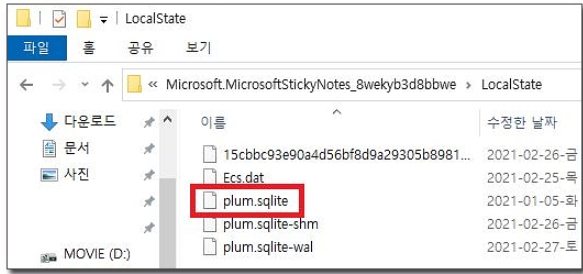 ㄹ) 위 사진에 보이는 plum.sqlite 파일이 스티커 메모 저장 파일인데 이 파일을 안전한 곳에 복사하셔서 백업하시면 됩니다.