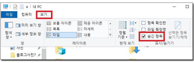ㄱ) 내 PC를 열어줍니다. 상단 탭에 [보기]를 선택하고 [숨긴항목]에 체크를 합니다.(시스템 숨김 파일에 스티커 메모가 저장되어 있기 때문입니다.)