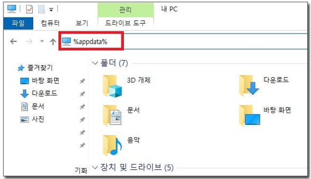 ㄱ) 탐색기를 열어준 후 탐색기 주소창에 %appdata% 를 입력하고 엔터를 눌러줍니다.