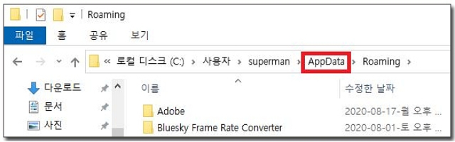 ㄴ) 자동으로 숨김파일까지 열어줍니다. Appdata 폴더에 들어가야되는데 자동으로 Roaming 폴더까지 들어가집니다. 백스페이스를 눌러서 Appdata 폴더에 들어가세요.