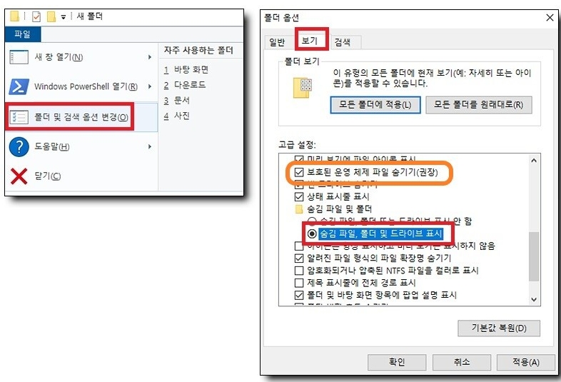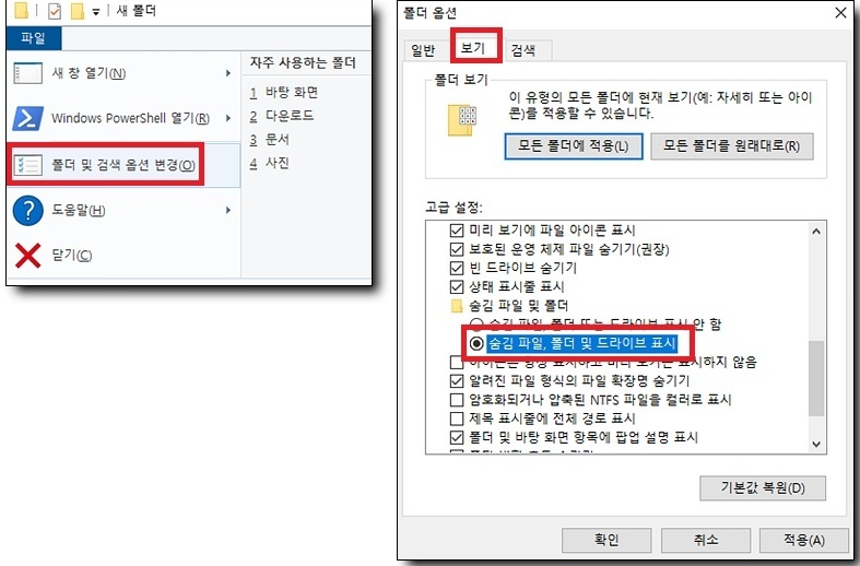 - 상단 탭에 보기를 선택해 주시고 중간정도 내려오시면 [숨김 파일, 폴더 및 드라이브 표시] 항목이 있습니다. 선택하고 적용을 누릅니다.
