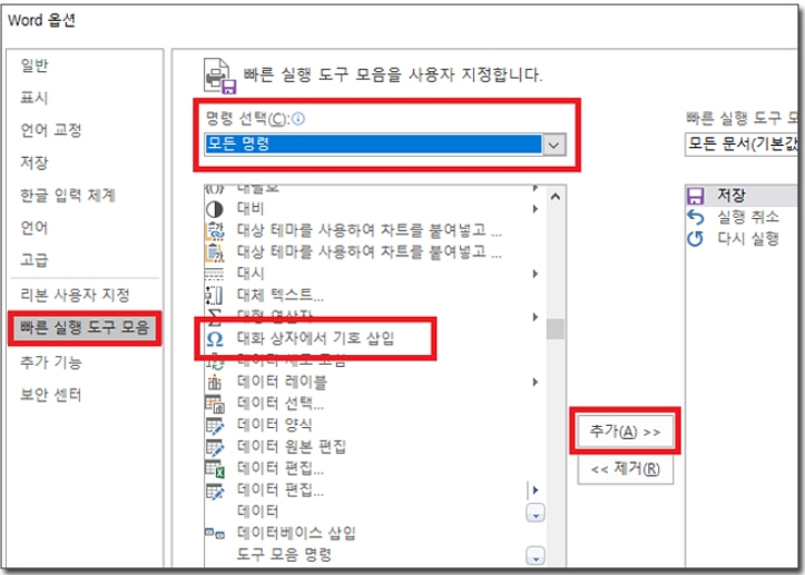 3) 우측에 [명령 선택(C)]에서 [모든 명령]으로 변경 후 아래 나오는 메뉴를 더 내려서 [대화 상자에서 기호 삽입]을 찾아 [추가] 합니다.