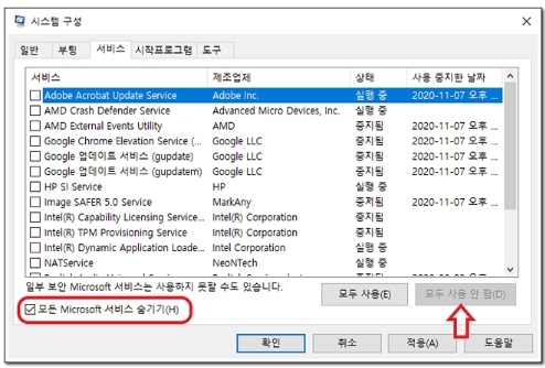 시스템 구성 시스템 구성 창이 열리며 시스템 구성 상단의 탭에서 서비스를 클릭하세요. 다음 부분이 정말 중요한데 서비스 탭이 열리면 하단에 "모든 Microsoft 서비스 숨기기(H)"라는 항목이 있어요. 이 항목에 꼭! 꼭! 체크를 하셔야 합니다. Microsoft 서비스 숨기기 항목에 체크를 하셨으면 우측 하단에 "모두 사용 안 함(D)"을 눌러주세요. 그러면 서비스 항목 모든 체크박스에 체크가 사라져요.
