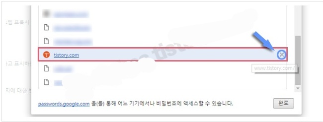 ▷ 비밀번화 관리 링크 클릭 시 팝업창이 뜨며 화면 하단의 [비밀번호를 저장하지 않은 사이트] 목록에서 해당 사이트를 찾아 사이트를 삭제해야 합니다. 사이트 도메인 우측의 ⓧ를 클릭한 후 [완료]를 클릭합니다.