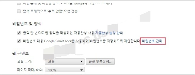 ▷ 설정 화면에서 스크롤을 중간쯤 내려 '비밀번호 및 양식' 을 찾습니다. 여기서 [비밀번호 대용 Google Smart Lock을 사용하여 비밀번호를 저장하도록 제안합니다] 옆의 [비밀번호 관리] 링크를 클릭합니다.