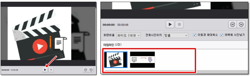 3.1~2번 작업을 반복해서 내가 원하는 사진을 편집하시고 미리보기 화면을 통해 만들기 전 미리 확인하실 수 있습니다. 또한 사진 순서를 변경하고 싶다면 타임라인에 있는 사진을 마우스로 앞뒤로 변경이 가능합니다. 모든 작업이 끝나시면 "만들기"버튼을 누르시면 동영상이 제작됩니다.