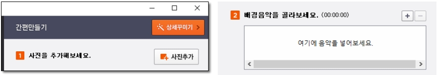 1."사진추가" 버튼을 눌러서 사진을 추가하신 후 +버튼을 눌러서 배경음악을 선택해줍니다.