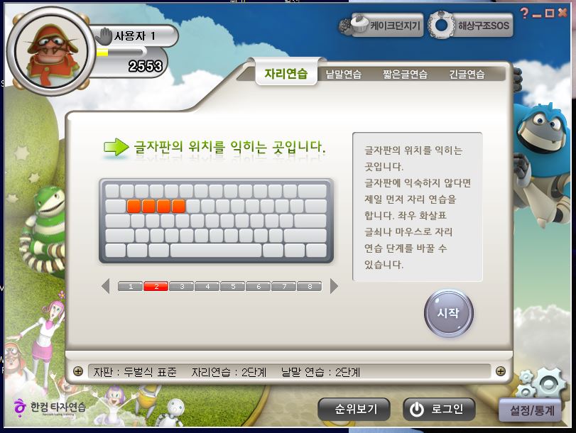 [자리연습] [낱말연습] [짧은글연습] [긴글연습] [케이크던지기] [해상구조SOS]를 하실 수 있습니다. 처음 하시는 분들은 자리연습을 통해서 글자판의 위치를 익히신 후 낱말연습, 짧은글연습을 통해서 타자 실력을 키워나가시면 됩니다.