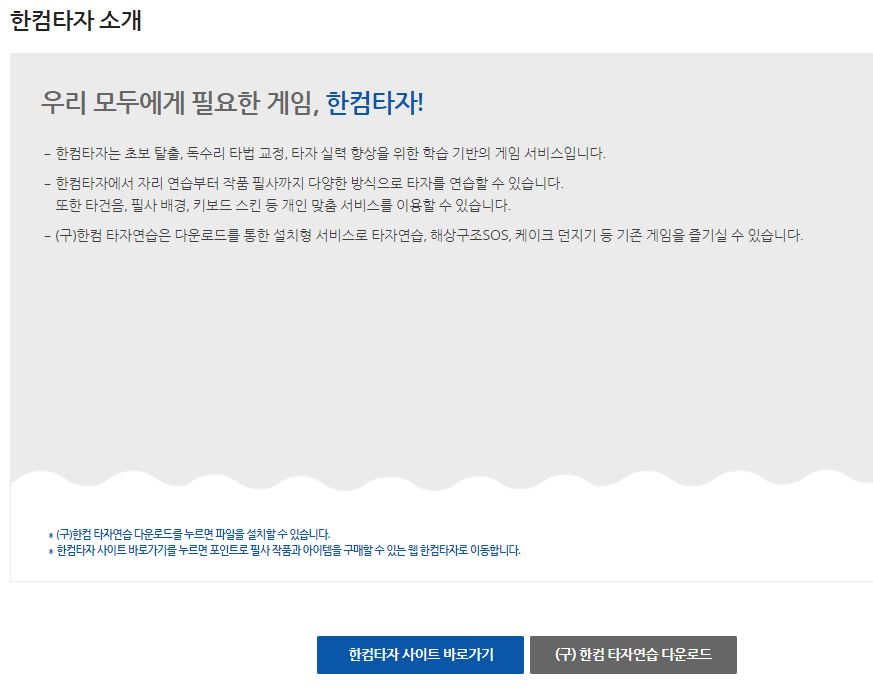 (구)한컴 타자연습 다운로드 버전은 설치형 한컴 타자연습과 해상구조SOS, 케이크 던지기 등 기존 게임을 그대로 사용하실 수 있으며 웹 기반 새로운 한컴 타자연습 사이트에 접속하시면 말랑말랑 무브먼트 캐릭터와 함께 한컴 타자연습 뿐만 아니라 동전쌓기, 두더지 잡기 등 캐주얼 게임도 즐기실 수 있습니다.