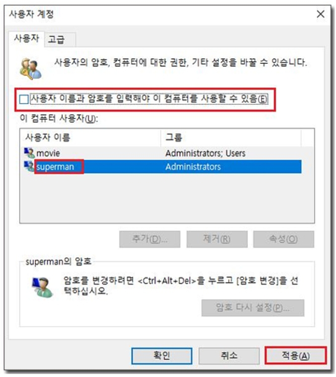 - [사용자 계정에서 로그인 없애기] 하실 때 체크박스가 나오지 않는다면 이렇게 해보세요.