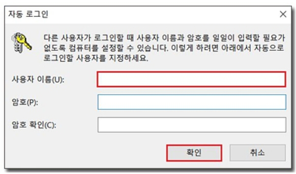 3) 적용을 누르면 자동 로그인 창이 열립니다. 사용자 이름에 아까 외웠던 사용자 이름을 입력하시고 [암호]에는 아무것도 입력하지 말고 [확인]을 눌러줍니다.