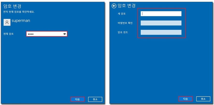 4) [암호 변경] 창이 나오면 현재 암호를 입력하고 [다음]을 눌러주세요. [새암호] 입력하는 창이 나오면 [아무것도 입력하지 말고] -> [다음] 을 눌러주세요.
