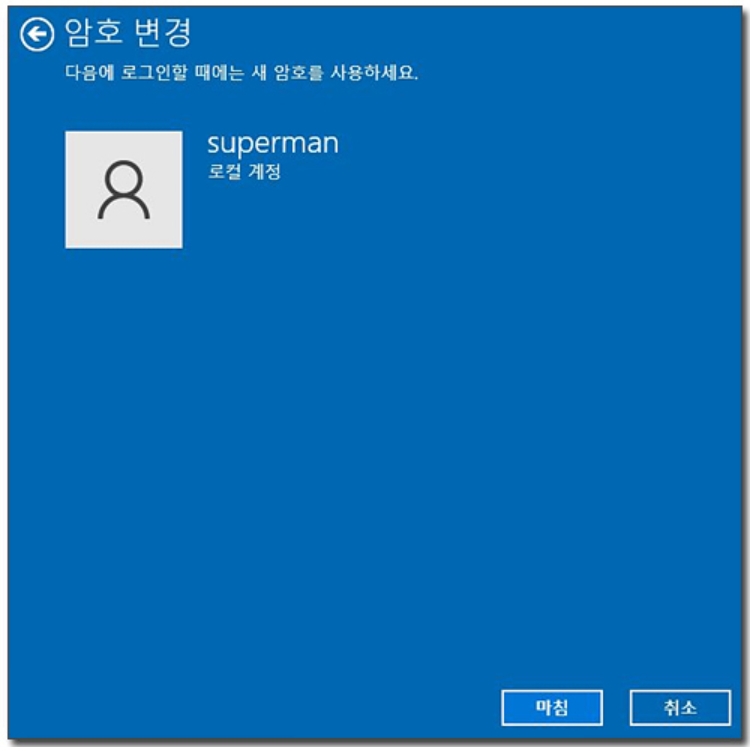 5) 암호 변경에서 [마침]을 눌러서 완료시켜 줍니다. 여기까지 하셨으면 컴퓨터 다시시작을 눌러서 재부팅 해주시면 윈도우 시작할 때 로그인 암호 입력하는 창이 나타나지 않습니다.