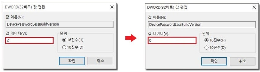 4) DWORD 값이 나오면 데이터를 2 -> 0 으로 수정하고 확인을 누릅니다. 이제 사용자 계정을 들어가시면 [사용자 이름과 암호를 입력해야 이 컴퓨터를 사용할 수 있음]이 정상적으로 나오실 겁니다.