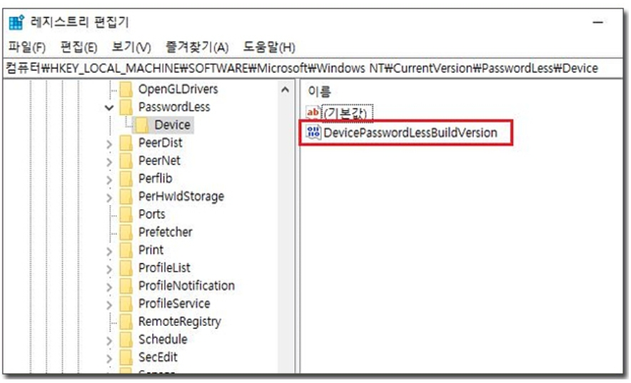 3) 레지스트리 편집기가 열리면 HKEY_LOCAL_MACHINE\SOFTWARE\Microsoft\Windows NT\CurrentVersion\PasswordLess\Device 이 경로로 들어가 줍니다. 이후 DevicePasswordLessBuildVersion 를 더블클릭 합니다.