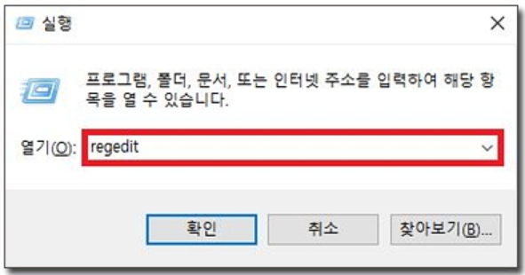 2) Windows키 + R키를 눌러 실행창을 열어준 후 regedit 를 입력합니다.