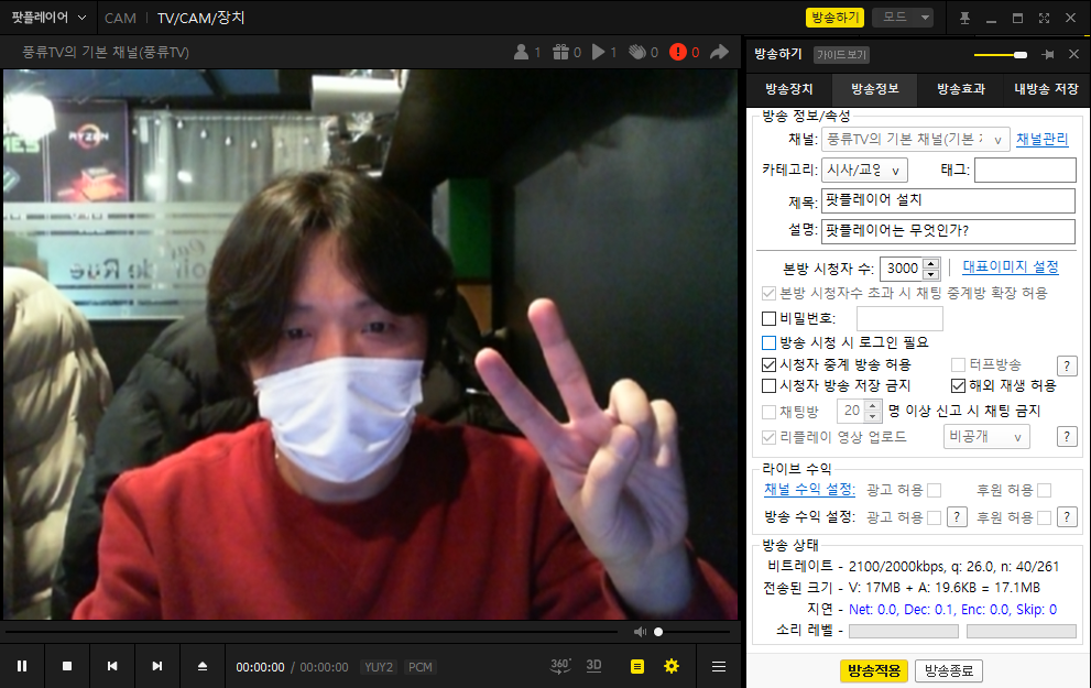 - 라이브 방송 : 팟플레이어를 통해 카카오TV로 간편하게 라이브방송을 송출할 수 있습니다. 팟플레이어를 설치하고 카카오TV 계정을 생성한 뒤 채널설정 및 방송 시작하기를 진행할 수 있습니다.
