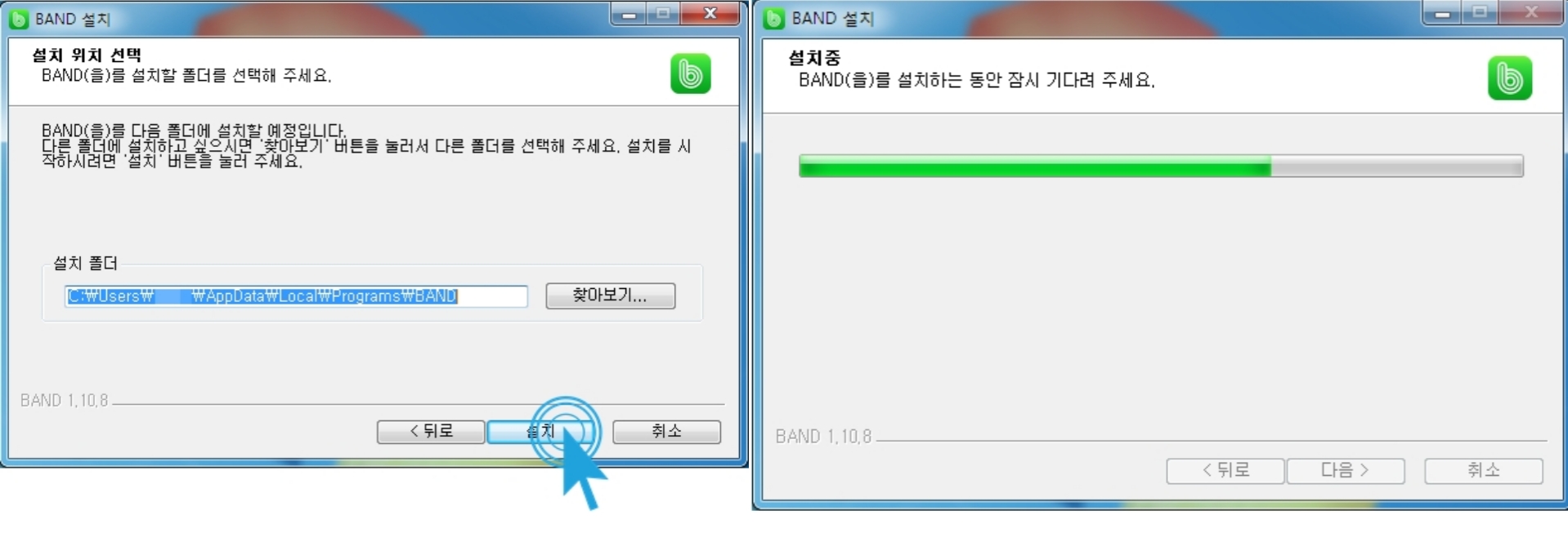 5. 밴드를 설치할 위치를 선택해서 설치를 눌러주시면 1분도 걸리지 않고 설치가 진행됩니다.