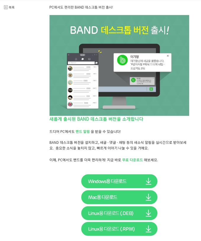 1. 밴드 PC버전은 밴드 홈페이지 공지사항을 통해서 배포가 되고 있으며 아래 다운로드 홈페이지 링크를 걸어 놓겠습니다.