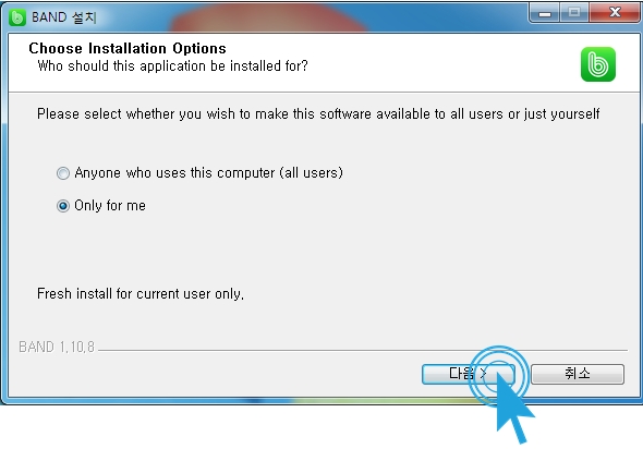 4. 밴드를 모든 사용자가 사용할지 아니면 본인만 사용할지 선택하는 옵션으로 잘 결정해서 선택 후 "다음"을 눌러주세요.